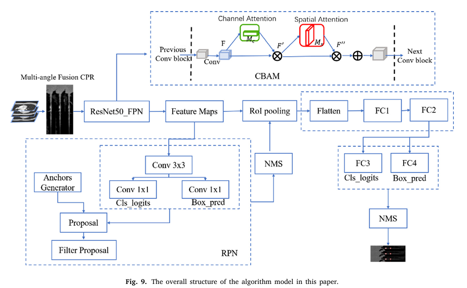 ResNet50-FPN 네트워크는 특징을 추출하였고, CBAM 모듈은 첫번째/마지막 합성곱 층 뒤에 추가되어 플라크 특징에 대한 주의력 향상