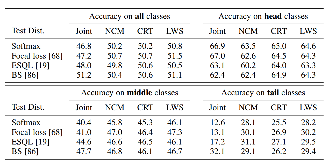 표 5를 보면, 정확도 측면에서는 거의 모든 long-tailed 방법들이 softmax 베이스라인 보다는 성능이 좋다