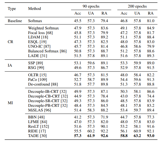 특히, LADE, Balaned softmax, LDAM은 SOTA 달성